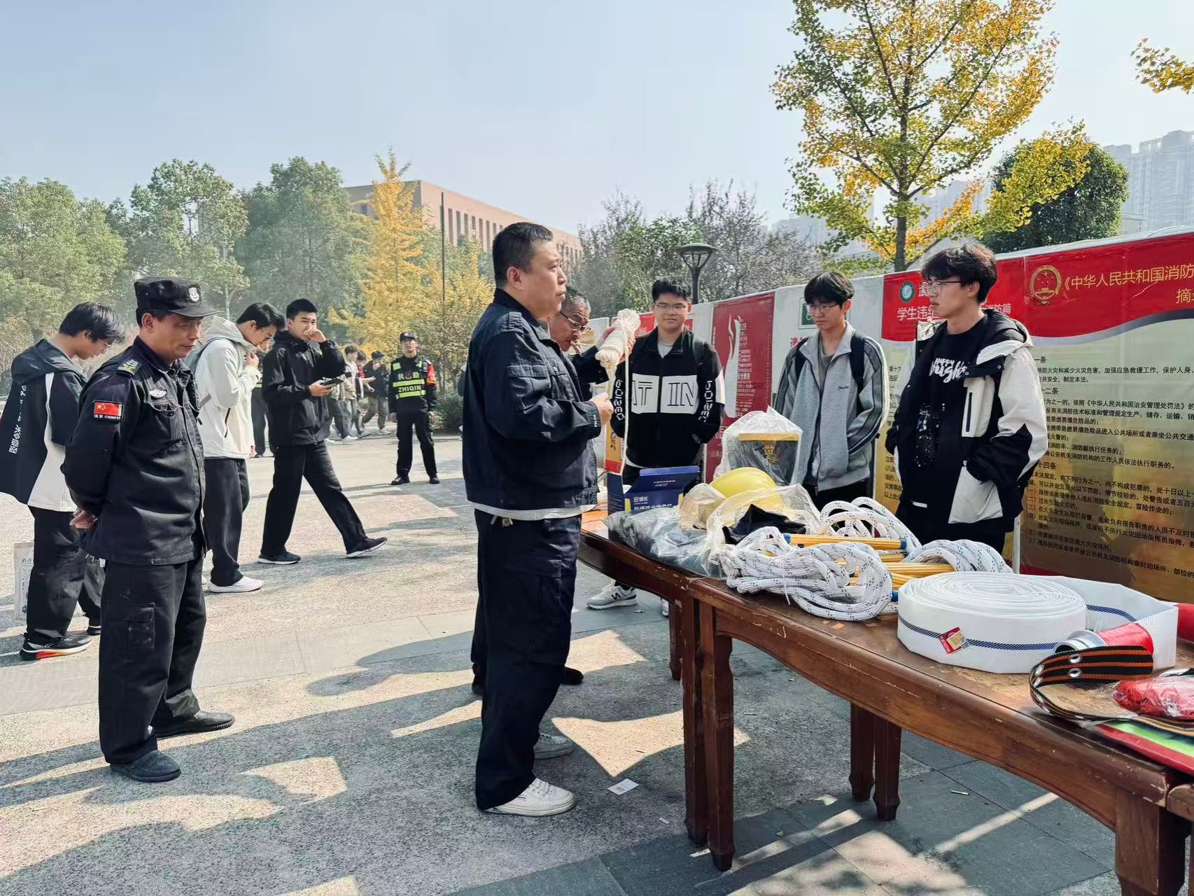 在消防器材展示区,yl88858cc工作人员向师生们详细讲解了各种常见消防器材,如逃生绳、消防水带、防火面罩、阻燃防火服等器材装备的功能和使用场景。同学们好奇地围在展台前,认真聆听讲解,并不时提问,对消防装备有了更直观和深入的了解。